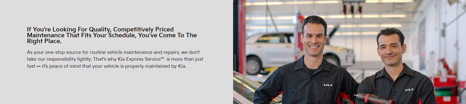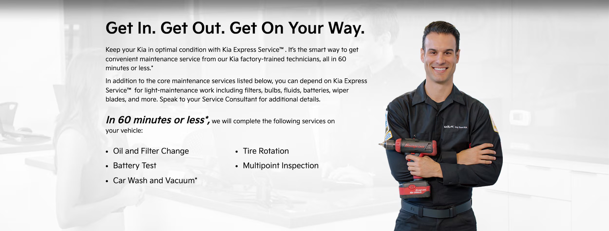 Come in today to Kia of Cape Coral for Fast, Quality and Convenient Maintenance service completed in 60 minutes or less! Car Wash and Vacuum Optional. Speak with a Service Consultant for full details.