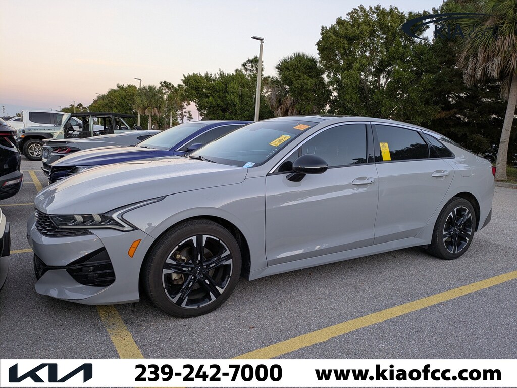 *** FACTORY CERTIFIED *** 10 YEAR X 100,000 MILE POWERTRAIN ONLY WARRANTY *** REMAINING AVAILABLE 5 YEAR X 60,000 MILE BUMPER-TO-BUMPER WARRANTY *** K5 GT-Line, Kia Certified Pre-Owned Certified, 4D Sedan, 1.6L I4 DGI Turbocharged DOHC 16V LEV3-ULEV70 180hp, 8-Speed Automatic, FWD, Wolf Gray, Black Cloth, 4-Wheel Disc Brakes, 6 Speakers, ABS brakes, Air Conditioning, Alloy wheels, AM/FM radio: SiriusXM, Apple CarPlay & Android Auto, Auto High-beam Headlights, Automatic temperature control, Brake assist, Bumpers: body-color, Carpeted Floor Mats, Cloth/SynTex Seat Trim, Delay-off headlights, Driver door bin, Driver vanity mirror, Dual front impact airbags, Dual front side impact airbags, EC Mirror w/Homelink, Electronic Stability Control, Forward Collision Avoidance-Assist, Four wheel independent suspension, Front anti-roll bar, Front Bucket Seats, Front Center Armrest, Front dual zone A/C, Front fog lights, Front reading lights, Fully automatic headlights, GT-Line Panoramic Sunroof Package, GT-Line Premium Package, Heated door mirrors, Highway Driving Assist, Illuminated entry, Knee airbag, LED Interior Lighting, LED Projection Headlamps, Low tire pressure warning, Navigation System, Occupant sensing airbag, Outside temperature display, Overhead airbag, Overhead console, Panic alarm, Panoramic Sunroof, Passenger door bin, Passenger vanity mirror, Power door mirrors, Power driver seat, Power steering, Power windows, Radio data system, Radio: AM/FM/MP3 Audio System, Rear anti-roll bar, Rear seat center armrest, Rear side impact airbag, Rear window defroster, Remote keyless entry, Security system, Smart Cruise Control w/Stop & Go, Speed control, Speed-sensing steering, Split folding rear seat, Spoiler, Sport steering wheel, Steering wheel mounted audio controls, Tachometer, Telescoping steering wheel, Tilt steering wheel, Traction control, Trip computer, Turn signal indicator mirrors, Variably intermittent wipers, Wheels: 18" Gloss Black Machined Finish Alloy, K5 GT-Line, 4D Sedan, 1.6L I4 DGI Turbocharged DOHC 16V LEV3-ULEV70 180hp, 8-Speed Automatic, FWD, Wolf Gray, Black Cloth.