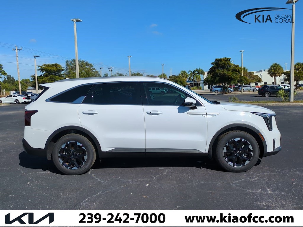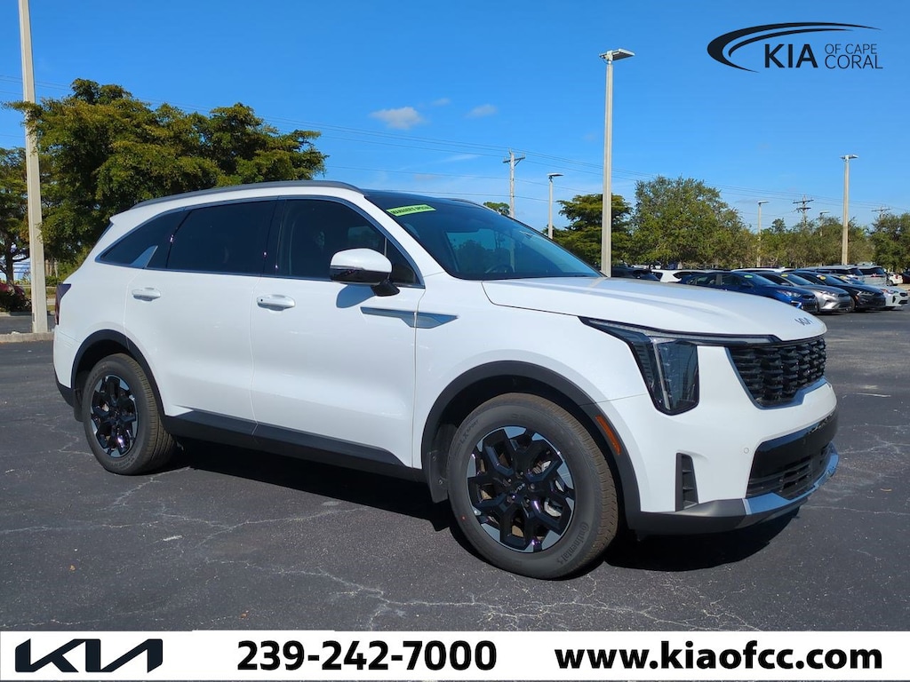 Glacial White Pearl 2025 Kia Sorento S FWD 8-Speed Automatic 2.5L I4 DGI DOHC 16V LEV3-SULEV30 191hp 3rd row seats: split-bench, 4-Wheel Disc Brakes, 6 Speakers, ABS brakes, Air Conditioning, Alloy wheels, AM/FM radio: SiriusXM, Apple CarPlay & Android Auto, Auto High-beam Headlights, Automatic temperature control, Brake assist, Bumpers: body-color, Delay-off headlights, Driver door bin, Driver vanity mirror, Dual front impact airbags, Dual front side impact airbags, Electronic Stability Control, Emergency communication system: 911 Connect, Exterior Parking Camera Rear, Four wheel independent suspension, Front anti-roll bar, Front Bucket Seats, Front Center Armrest, Front dual zone A/C, Front reading lights, Fully automatic headlights, Heated door mirrors, Heated Front Bucket Seats, Heated front seats, Illuminated entry, Knee airbag, Leather Shift Knob, Leather steering wheel, Low tire pressure warning, Navigation System, Occupant sensing airbag, Outside temperature display, Overhead airbag, Overhead console, Panic alarm, Passenger door bin, Passenger vanity mirror, Power door mirrors, Power driver seat, Power steering, Power windows, Radio data system, Radio: AM/FM Standard Sound System, Rear anti-roll bar, Rear reading lights, Rear seat center armrest, Rear side impact airbag, Rear window defroster, Rear window wiper, Remote keyless entry, Security system, Smart Key w/ Push Button and Remote Start, Speed control, Speed-sensing steering, Split folding rear seat, Spoiler, Steering wheel mounted audio controls, SynTex Artificial Leather Seat Trim, Tachometer, Telescoping steering wheel, Tilt steering wheel, Traction control, Trip computer, Turn signal indicator mirrors, Variably intermittent wipers, Wheels: 18" Gloss Black Alloy.