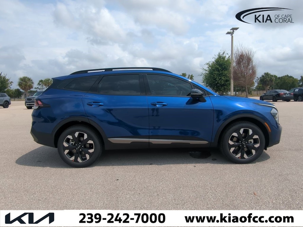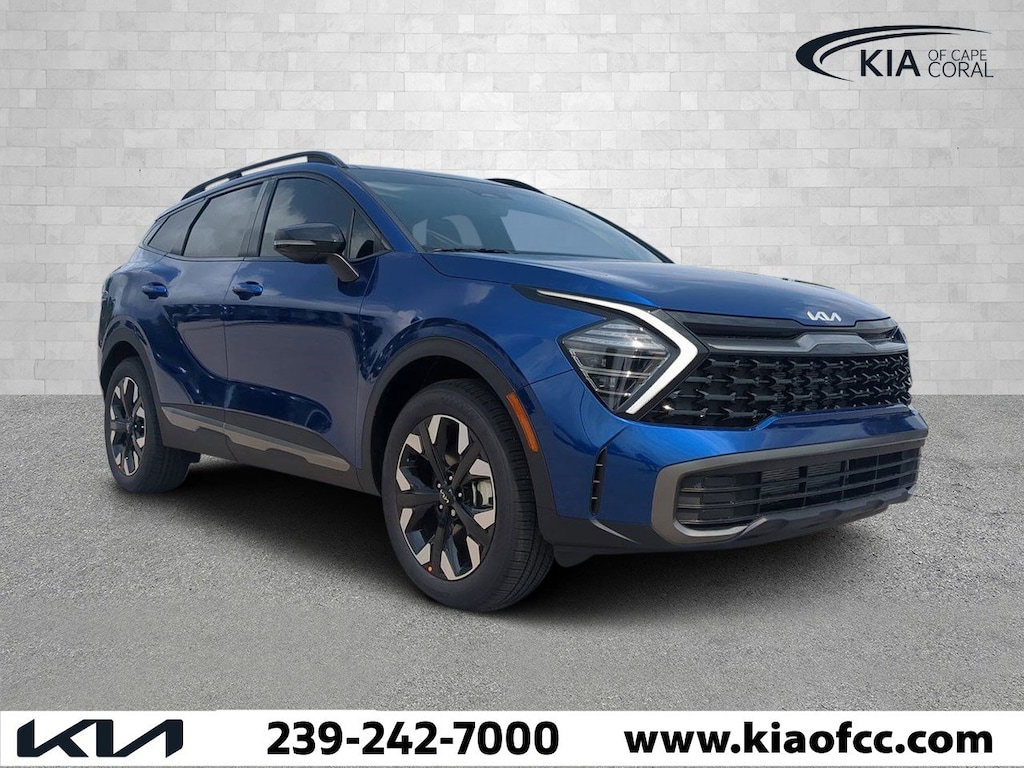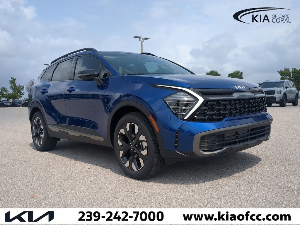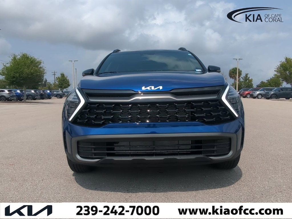 Sapphire Blue 2024 Kia Sportage X-Line AWD 8-Speed Automatic I4 Sportage X-Line, 4D Sport Utility, I4, 8-Speed Automatic, AWD, Sapphire Blue, Black w/Premium Leatherette Seat Trim, LED Interior Lighting, Panoramic Sunroof, Smart Power Liftgate, X-Line Premium Package, 4-Wheel Disc Brakes, 6 Speakers, ABS brakes, Air Conditioning, Alloy wheels, AM/FM radio: SiriusXM, Auto High-beam Headlights, Automatic temperature control, Axle Ratio: 3.648, Brake assist, Bumpers: body-color, Compass, Delay-off headlights, Driver door bin, Driver vanity mirror, Dual front impact airbags, Dual front side impact airbags, Electronic Stability Control, Emergency communication system, Four wheel independent suspension, Front anti-roll bar, Front Bucket Seats, Front Center Armrest, Front dual zone A/C, Fully automatic headlights, Heated door mirrors, Heated Front Bucket Seats, Heated front seats, Illuminated entry, Leather steering wheel, Low tire pressure warning, Navigation System, Occupant sensing airbag, Outside temperature display, Overhead airbag, Overhead console, Panic alarm, Passenger door bin, Passenger vanity mirror, Power door mirrors, Power driver seat, Power steering, Power windows, Premium Leatherette Seat Trim, Radio: AM/FM/HD Audio System, Rain sensing wipers, Rear anti-roll bar, Rear seat center armrest, Rear side impact airbag, Rear window defroster, Rear window wiper, Remote keyless entry, Security system, Speed control, Speed-sensing steering, Split folding rear seat, Spoiler, Steering wheel mounted audio controls, Tachometer, Telescoping steering wheel, Tilt steering wheel, Traction control, Trip computer, Turn signal indicator mirrors, Variably intermittent wipers, Wheels: 19" Gloss Black Alloy, Sportage X-Line, 4D Sport Utility, I4, 8-Speed Automatic, AWD, Sapphire Blue, Black w/Premium Leatherette Seat Trim, LED Interior Lighting, Panoramic Sunroof, Smart Power Liftgate, X-Line Premium Package.