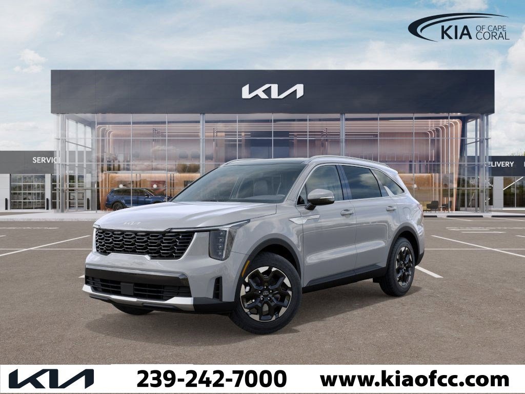 Gray 2025 Kia Sorento S FWD 8-Speed Automatic 2.5L I4 DGI DOHC 16V LEV3-SULEV30 191hp Sorento S, 4D Sport Utility, 2.5L I4 DGI DOHC 16V LEV3-SULEV30 191hp, 8-Speed Automatic, Gray, Gry Syntex Artificial Lth Leather, 3rd row seats: split-bench, 4-Wheel Disc Brakes, 6 Speakers, ABS brakes, Air Conditioning, Alloy wheels, AM/FM radio: SiriusXM, Apple CarPlay & Android Auto, Auto High-beam Headlights, Automatic temperature control, Brake assist, Bumpers: body-color, Delay-off headlights, Driver door bin, Driver vanity mirror, Dual front impact airbags, Dual front side impact airbags, Electronic Stability Control, Emergency communication system: 911 Connect, Exterior Parking Camera Rear, Four wheel independent suspension, Front anti-roll bar, Front Bucket Seats, Front Center Armrest, Front dual zone A/C, Front reading lights, Fully automatic headlights, Heated door mirrors, Heated Front Bucket Seats, Heated front seats, Illuminated entry, Knee airbag, Leather Shift Knob, Leather steering wheel, Low tire pressure warning, Navigation System, Occupant sensing airbag, Outside temperature display, Overhead airbag, Overhead console, Panic alarm, Passenger door bin, Passenger vanity mirror, Power door mirrors, Power driver seat, Power steering, Power windows, Radio data system, Radio: AM/FM Standard Sound System, Rear anti-roll bar, Rear reading lights, Rear seat center armrest, Rear side impact airbag, Rear window defroster, Rear window wiper, Remote keyless entry, Security system, Smart Key w/ Push Button and Remote Start, Speed control, Speed-sensing steering, Split folding rear seat, Spoiler, Steering wheel mounted audio controls, SynTex Artificial Leather Seat Trim, Tachometer, Telescoping steering wheel, Tilt steering wheel, Traction control, Trip computer, Turn signal indicator mirrors, Variably intermittent wipers, Wheels: 18" Gloss Black Alloy, Sorento S, 4D Sport Utility, 2.5L I4 DGI DOHC 16V LEV3-SULEV30 191hp, 8-Speed Automatic, Gray, Gry Syntex Artificial Lth Leather.