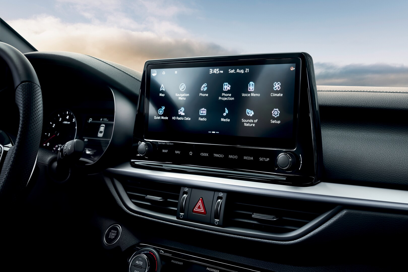 An eight-inch touchscreen display anchors the Forte infotainment system. Wireless Android Auto™ and Apple CarPlay® make it easy to connect your smartphone to the infotainment system. Four speakers are standard, but an available eight-speaker Harmon Kardon premium audio system provides exceptional sound quality.
