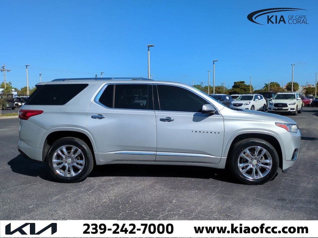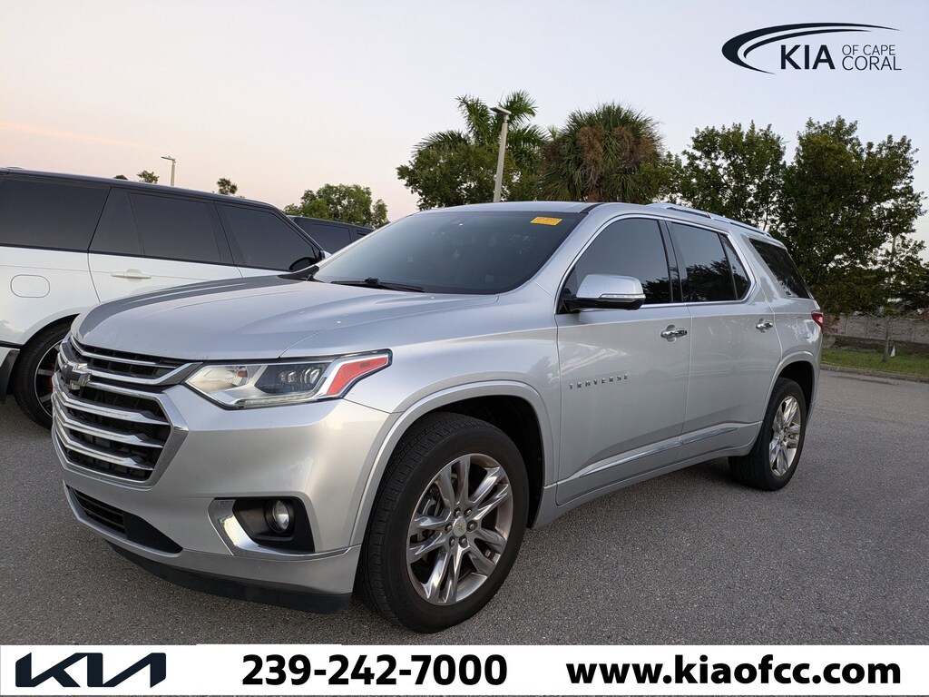 Traverse High Country, 4D Sport Utility, 3.6L V6 SIDI VVT, 9-Speed Automatic, FWD, Silver Ice Metallic, Jet Black Leather, 10 Speakers, 1st & 2nd Row All-Weather Floor Liner (LPO), 20" Polished Aluminum Wheels, 3.49 Axle Ratio, 3rd Row All-Weather Floor Liner (LPO), 3rd row seats: split-bench, 4-Wheel Disc Brakes, 7-Passenger Seating (2-2-3 Seating Configuration), ABS brakes, Air Conditioning, Alloy wheels, AM/FM radio: SiriusXM, Apple CarPlay/Android Auto, Auto High-beam Headlights, Auto-dimming door mirrors, Auto-dimming Rear-View mirror, Automatic temperature control, Bose Premium 10-Speaker Audio System Feature, Brake assist, Bumpers: body-color, Compass, Delay-off headlights, Driver door bin, Driver vanity mirror, Dual front impact airbags, Dual front side impact airbags, Electronic Stability Control, Emergency communication system: OnStar and Chevrolet connected services capable, Floor Liner Package (LPO), Four wheel independent suspension, Front & Rear Black Bowtie Emblems (LPO), Front anti-roll bar, Front Bucket Seats, Front Center Armrest, Front dual zone A/C, Front fog lights, Front reading lights, Fully automatic headlights, Garage door transmitter, Heated door mirrors, Heated front seats, Heated rear seats, Heated steering wheel, Illuminated entry, Integrated Cargo Liner (LPO), Leather steering wheel, Low tire pressure warning, Memory seat, Navigation System, Occupant sensing airbag, Outside temperature display, Overhead airbag, Overhead console, Panic alarm, Passenger door bin, Passenger vanity mirror, Perforated Leather-Appointed Seat Trim, Power door mirrors, Power driver seat, Power Liftgate, Power moonroof: Dual SkyScape, Power passenger seat, Power steering, Power windows, Preferred Equipment Group 2LZ, Premium audio system: Chevrolet MyLink, Radio data system, Radio: Chevrolet Infotainment 3 Premium System, Rear air conditioning, Rear anti-roll bar, Rear reading lights, Rear window defroster, Rear window wiper, Remote keyless entry, Roof rack: rails only, Security system, SiriusXM w/360L, Speed control, Speed-sensing steering, Spoiler, Steering wheel memory, Steering wheel mounted audio controls, Tachometer, Telescoping steering wheel, Tilt steering wheel, Traction control, Trip computer, Turn signal indicator mirrors, Variably intermittent wipers, Ventilated front seats, Voltmeter, Traverse High Country, 4D Sport Utility, 3.6L V6 SIDI VVT, 9-Speed Automatic, FWD, Silver Ice Metallic, Jet Black Leather.
