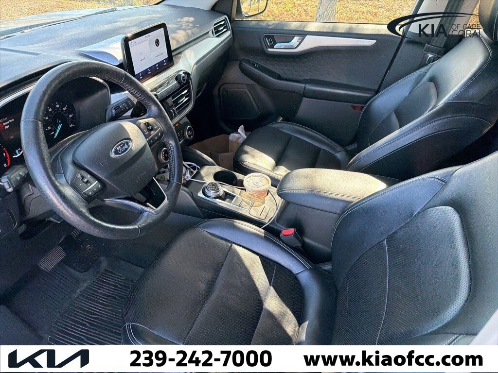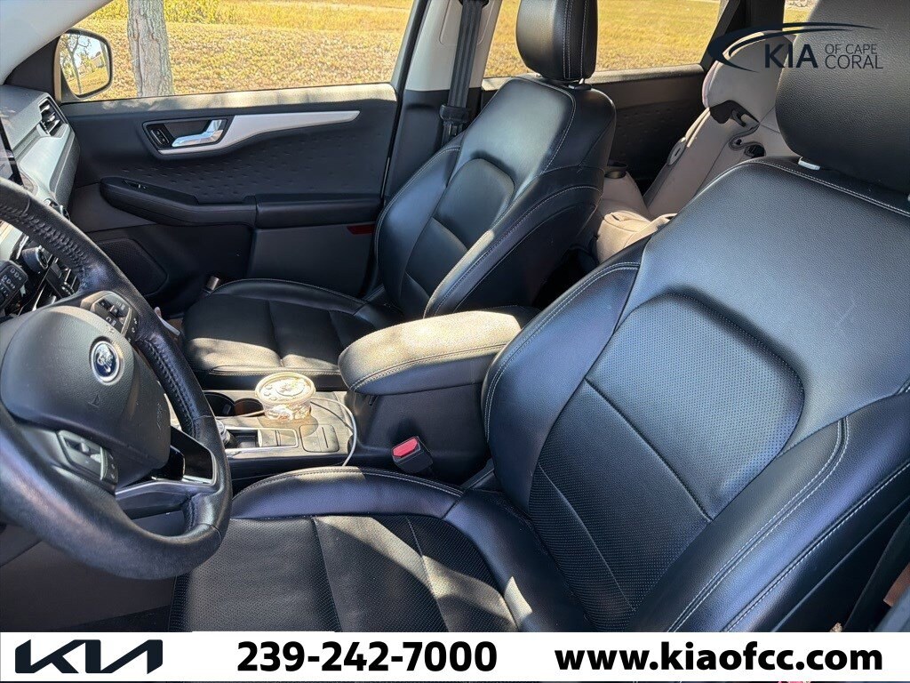 Escape SEL, 4D Sport Utility, 1.5L EcoBoost, 8-Speed Automatic, FWD, White Metallic, Ebony, 18" Machined-Face Aluminum Wheels, 3.52 Axle Ratio, 4-Wheel Disc Brakes, 6 Speakers, ABS brakes, Air Conditioning, Alloy wheels, AM/FM radio: SiriusXM, AM/FM Stereo, Auto High-beam Headlights, Automatic temperature control, Black Roof-Rack Side Rails, Brake assist, Bumpers: body-color, Compass, Delay-off headlights, Driver door bin, Driver vanity mirror, Dual front impact airbags, Dual front side impact airbags, Electronic Stability Control, Emergency communication system: SYNC 3 911 Assist, Equipment Group 301A, Exterior Parking Camera Rear, FordPass Connect, Four wheel independent suspension, Front & Rear Floor Liners, Front anti-roll bar, Front Bucket Seats, Front Center Armrest, Front fog lights, Front reading lights, Fully automatic headlights, Heated ActiveX Front Sport Contour Bucket Seats, Heated door mirrors, Heated front seats, Heated steering wheel, Illuminated entry, Knee airbag, Leather steering wheel, Low tire pressure warning, Memory seat, Occupant sensing airbag, Outside temperature display, Overhead airbag, Overhead console, Panic alarm, Panoramic Vista Roof, Passenger door bin, Passenger vanity mirror, Power door mirrors, Power driver seat, Power Liftgate, Power steering, Power windows, Radio data system, Rear anti-roll bar, Rear reading lights, Rear seat center armrest, Rear window defroster, Rear window wiper, Remote keyless entry, Speed control, Speed-sensing steering, Speed-Sensitive Wipers, Split folding rear seat, Spoiler, Steering wheel mounted audio controls, SYNC 3 Communications & Entertainment System, Tachometer, Telescoping steering wheel, Tilt steering wheel, Traction control, Trip computer, Variably intermittent wipers, Escape SEL, 4D Sport Utility, 1.5L EcoBoost, 8-Speed Automatic, FWD, White Metallic, Ebony.