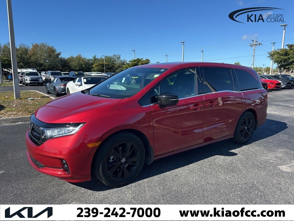 Odyssey Sport, 4D Passenger Van, 3.5L V6 SOHC i-VTEC 24V, 10-Speed Automatic, FWD, Radiant Red Metallic II, Black w/Leather Seat Trim, 3.61 Axle Ratio, 3rd row seats: split-bench, 4-Wheel Disc Brakes, 7 Speakers, A/V remote: CabinControl, ABS brakes, Adaptive Cruise Control: Adaptive Cruise Control (ACC) with Low-Speed Follow, Air Conditioning, Alloy wheels, AM/FM radio: SiriusXM, Anti-whiplash front head restraints, Apple CarPlay/Android Auto, Auto High-beam Headlights, Auto-dimming Rear-View mirror, Automatic temperature control, Blind Spot Information (BSI) System warning, Brake assist, Bumpers: body-color, Delay-off headlights, Driver door bin, Driver vanity mirror, Driver's Seat Mounted Armrest, Dual front impact airbags, Dual front side impact airbags, Electronic Stability Control, Exterior Parking Camera Rear, Four wheel independent suspension, Front anti-roll bar, Front Bucket Seats, Front dual zone A/C, Front fog lights, Front reading lights, Fully automatic headlights, Garage door transmitter: HomeLink, Heated door mirrors, Heated Front Bucket Seats, Heated front seats, Illuminated entry, Knee airbag, Lane departure: Lane Keeping Assist System (LKAS) active, Leather Seat Trim, Leather steering wheel, Low tire pressure warning, Memory seat, Occupant sensing airbag, Outside temperature display, Overhead airbag, Overhead console, Panic alarm, Passenger door bin, Passenger seat mounted armrest, Passenger vanity mirror, Power door mirrors, Power driver seat, Power Liftgate, Power moonroof, Power passenger seat, Power steering, Power windows, Radio data system, Radio: 160-Watt AM/FM/HD/SiriusXM Audio System, Rear air conditioning, Rear anti-roll bar, Rear reading lights, Rear seat center armrest, Rear window defroster, Rear window wiper, Reclining 3rd row seat, Remote keyless entry, Security system, Speed control, Speed-sensing steering, Speed-Sensitive Wipers, Split folding rear seat, Spoiler, Steering wheel mounted audio controls, Tachometer, Telescoping steering wheel, Tilt steering wheel, Traction control, Trip computer, Turn signal indicator mirrors, Variably intermittent wipers, Wheels: 19" Gloss Black Alloy, Odyssey Sport, 4D Passenger Van, 3.5L V6 SOHC i-VTEC 24V, 10-Speed Automatic, FWD, Radiant Red Metallic II, Black w/Leather Seat Trim.