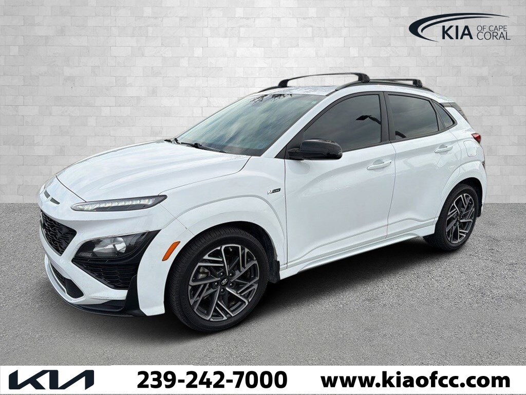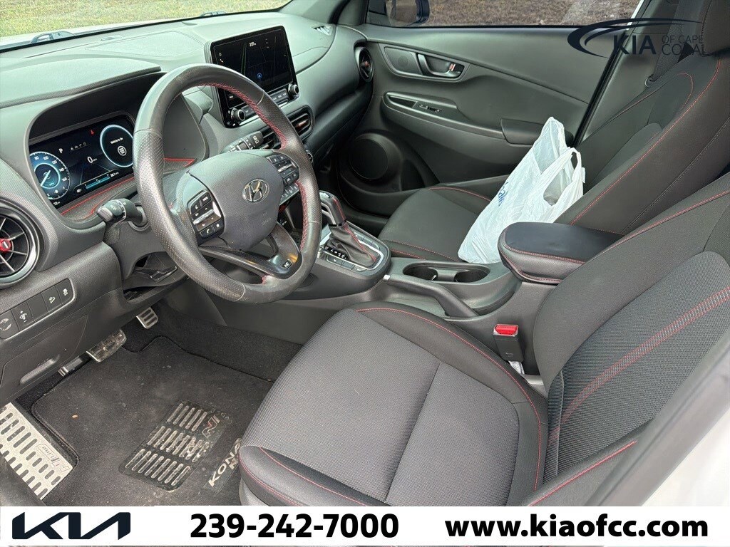 Kona N Line, 4D Sport Utility, I4, Shiftronic, FWD, Lunar White, Black Cloth, 18" x 7.5J Alloy Wheels, 3.174 Axle Ratio, 4-Wheel Disc Brakes, 6 Speakers, ABS brakes, Air Conditioning, Alloy wheels, AM/FM radio: SiriusXM, Apple CarPlay & Android Auto, Automatic temperature control, Brake assist, Bumpers: body-color, Cargo Blocks, Cargo Net, Cargo Package, Cargo Tray, Carpeted Floor Mats, Delay-off headlights, Door Sill Plates, Driver door bin, Driver vanity mirror, Dual front impact airbags, Dual front side impact airbags, Electronic Stability Control, Emergency communication system: Blue Link Connected Car Service (3-year complimentary subscription), Exterior Parking Camera Rear, First Aid Kit, Front anti-roll bar, Front Bucket Seats, Front Center Armrest, Front reading lights, Front wheel independent suspension, Fully automatic headlights, Heated door mirrors, Heated front seats, Heated Sport Front Bucket Seats, Illuminated entry, Leather Shift Knob, Leather steering wheel, Low tire pressure warning, Navigation System, Occupant sensing airbag, Option Group 01, Outside temperature display, Overhead airbag, Overhead console, Panic alarm, Passenger door bin, Passenger vanity mirror, Power door mirrors, Power driver seat, Power moonroof, Power steering, Power windows, Radio: AM/FM/HD/SiriusXM Audio System, Rear Bumper Applique, Rear seat center armrest, Rear window defroster, Rear window wiper, Remote keyless entry, Security system, Speed control, Speed-sensing steering, Split folding rear seat, Spoiler, Sport Cloth Seat Trim, Steering wheel mounted audio controls, Tachometer, Telescoping steering wheel, Tilt steering wheel, Traction control, Trip computer, Turn signal indicator mirrors, Variably intermittent wipers, Kona N Line, 4D Sport Utility, I4, Shiftronic, FWD, Lunar White, Black Cloth.