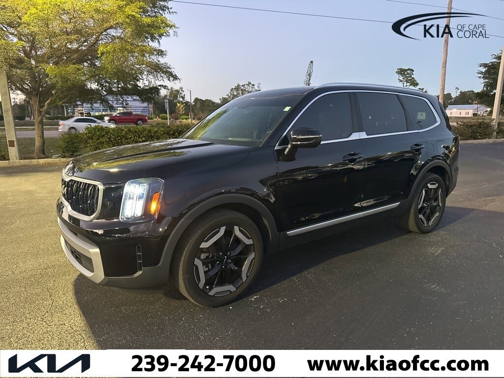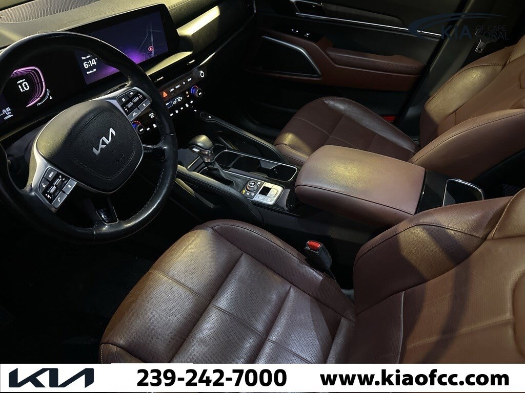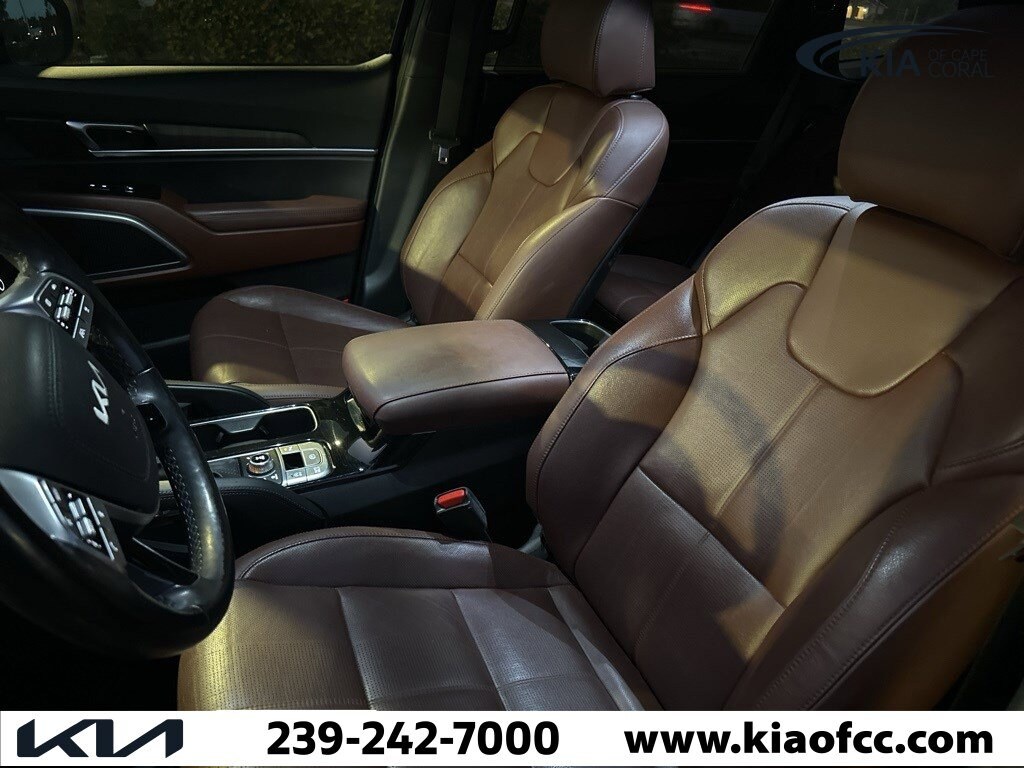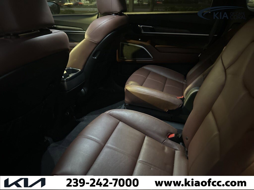 Kia Certified Pre-Owned Certified, 2nd Row Captain Chairs, 3.648 Axle Ratio, 3rd row seats: split-bench, 4-Wheel Disc Brakes, 6 Speakers, ABS brakes, Air Conditioning, Alloy wheels, AM/FM radio: SiriusXM, Apple CarPlay & Android Auto, Auto High-beam Headlights, Auto-dimming Rear-View mirror, Automatic temperature control, Brake assist, Bumpers: body-color, Carpet Floor Mats, Compass, Delay-off headlights, Driver door bin, Driver vanity mirror, Dual front impact airbags, Dual front side impact airbags, Electronic Stability Control, Emergency communication system: 911 Connect, EX Captain's Chair Package, Exterior Parking Camera Rear, Four wheel independent suspension, Front anti-roll bar, Front Bucket Seats, Front Center Armrest, Front dual zone A/C, Front reading lights, Fully automatic headlights, Heated & Ventilated Front Bucket Seats, Heated door mirrors, Heated front seats, Heated steering wheel, Illuminated entry, Knee airbag, Leather Seat Trim, Leather Shift Knob, Leather steering wheel, Low tire pressure warning, Mahogany Interior Color Package, Navigation System, Occupant sensing airbag, Outside temperature display, Overhead airbag, Overhead console, Panic alarm, Passenger door bin, Passenger vanity mirror, Power door mirrors, Power driver seat, Power Liftgate, Power moonroof, Power passenger seat, Power steering, Power windows, Radio data system, Radio: AM/FM Display Audio System, Rear air conditioning, Rear anti-roll bar, Rear audio controls, Rear reading lights, Rear seat center armrest, Rear side impact airbag, Rear window defroster, Rear window wiper, Reclining 3rd row seat, Remote keyless entry, Roof rack: rails only, Security system, Smart Key w/ Push Button and Remote Start, Speed control, Speed-sensing steering, Split folding rear seat, Spoiler, Steering wheel mounted audio controls, Tachometer, Telescoping steering wheel, Tilt steering wheel, Traction control, Trip computer, Turn signal indicator mirrors, Variably intermittent wipers, Ventilated front seats, Wheels: 20" x 7.5" Black Finish.