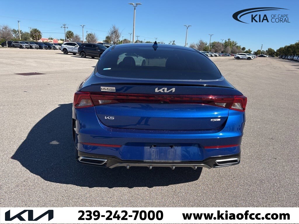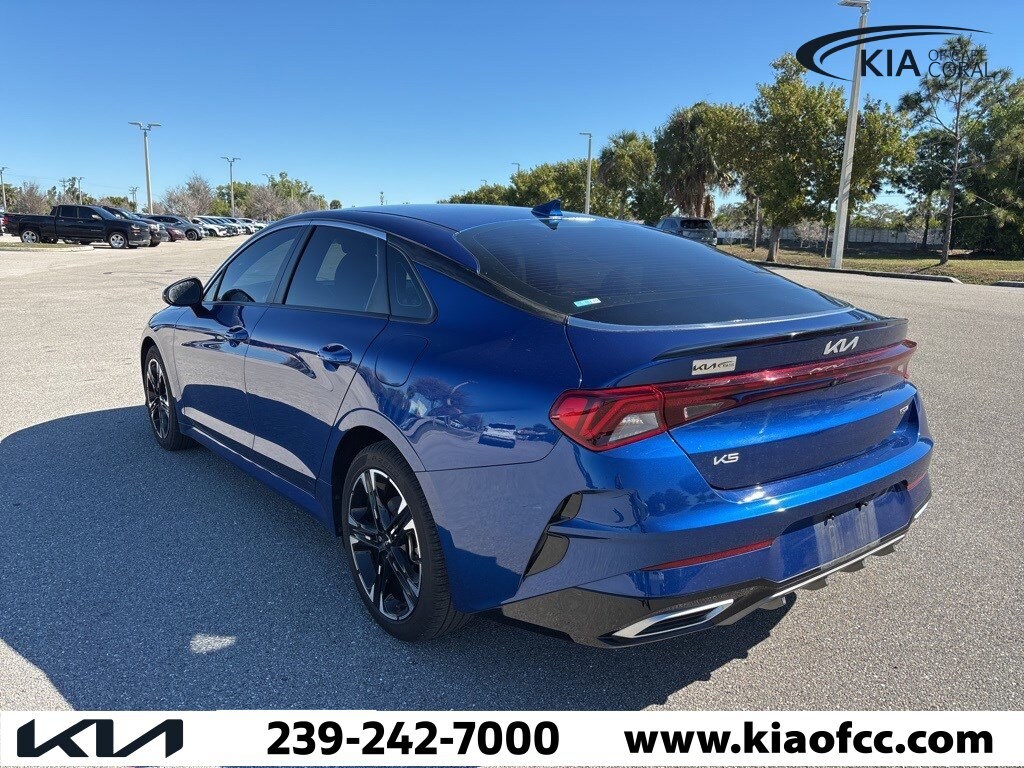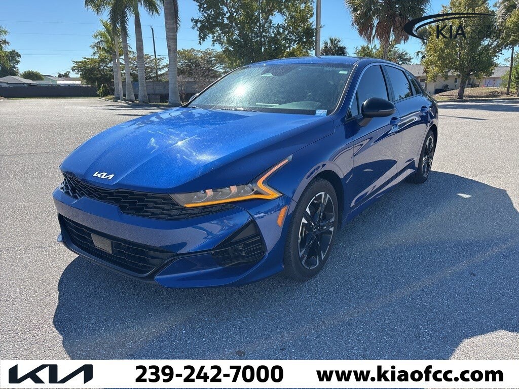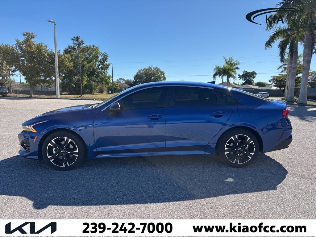 *** FACTORY CERTIFIED *** 10 YEAR X 100,000 MILE POWERTRAIN ONLY WARRANTY *** REMAINING AVAILABLE 5 YEAR X 60,000 MILE BUMPER-TO-BUMPER WARRANTY *** K5 GT-Line, Kia Certified Pre-Owned Certified, 4D Sedan, 1.6L I4 DGI Turbocharged DOHC 16V LEV3-ULEV70 180hp, 8-Speed Automatic, FWD, Sapphire Blue, Black Cloth, 4-Wheel Disc Brakes, 6 Speakers, ABS brakes, Air Conditioning, Alloy wheels, AM/FM radio: SiriusXM, Apple CarPlay & Android Auto, Auto High-beam Headlights, Automatic temperature control, Brake assist, Bumpers: body-color, Carpeted Floor Mats, Cloth/SynTex Seat Trim, Delay-off headlights, Driver door bin, Driver vanity mirror, Dual front impact airbags, Dual front side impact airbags, Electronic Stability Control, Forward Collision Avoidance-Assist, Four wheel independent suspension, Front anti-roll bar, Front Bucket Seats, Front Center Armrest, Front dual zone A/C, Front fog lights, Front reading lights, Fully automatic headlights, GT-Line Premium Package, Heated door mirrors, Heated Front Bucket Seats, Heated front seats, Highway Driving Assist, Illuminated entry, Knee airbag, Leather steering wheel, LED Projection Headlamps, Low tire pressure warning, Navigation System, Occupant sensing airbag, Outside temperature display, Overhead airbag, Overhead console, Panic alarm, Passenger door bin, Passenger vanity mirror, Power door mirrors, Power driver seat, Power steering, Power windows, Radio data system, Radio: AM/FM/MP3 Audio System, Rear anti-roll bar, Rear seat center armrest, Rear side impact airbag, Rear window defroster, Remote keyless entry, Security system, Smart Cruise Control w/Stop & Go, Speed control, Speed-sensing steering, Split folding rear seat, Spoiler, Sport steering wheel, Steering wheel mounted audio controls, Tachometer, Telescoping steering wheel, Tilt steering wheel, Traction control, Trip computer, Turn signal indicator mirrors, Variably intermittent wipers, Wheels: 18" Gloss Black Machined Finish Alloy, K5 GT-Line, 4D Sedan, 1.6L I4 DGI Turbocharged DOHC 16V LEV3-ULEV70 180hp, 8-Speed Automatic, FWD, Sapphire Blue, Black Cloth.