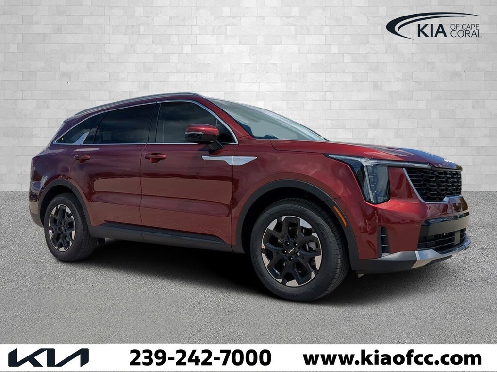 Dawning Red 2025 Kia Sorento S FWD 8-Speed Automatic 2.5L I4 DGI DOHC 16V LEV3-SULEV30 191hp 3rd row seats: split-bench, 4-Wheel Disc Brakes, 6 Speakers, ABS brakes, Air Conditioning, Alloy wheels, AM/FM radio: SiriusXM, Apple CarPlay & Android Auto, Auto High-beam Headlights, Automatic temperature control, Brake assist, Bumpers: body-color, Delay-off headlights, Driver door bin, Driver vanity mirror, Dual front impact airbags, Dual front side impact airbags, Electronic Stability Control, Emergency communication system: 911 Connect, Exterior Parking Camera Rear, Four wheel independent suspension, Front anti-roll bar, Front Bucket Seats, Front Center Armrest, Front dual zone A/C, Front reading lights, Fully automatic headlights, Heated door mirrors, Heated Front Bucket Seats, Heated front seats, Illuminated entry, Knee airbag, Leather Shift Knob, Leather steering wheel, Low tire pressure warning, Navigation System, Occupant sensing airbag, Outside temperature display, Overhead airbag, Overhead console, Panic alarm, Passenger door bin, Passenger vanity mirror, Power door mirrors, Power driver seat, Power steering, Power windows, Radio data system, Radio: AM/FM Standard Sound System, Rear anti-roll bar, Rear reading lights, Rear seat center armrest, Rear side impact airbag, Rear window defroster, Rear window wiper, Remote keyless entry, Security system, Smart Key w/ Push Button and Remote Start, Speed control, Speed-sensing steering, Split folding rear seat, Spoiler, Steering wheel mounted audio controls, SynTex Artificial Leather Seat Trim, Tachometer, Telescoping steering wheel, Tilt steering wheel, Traction control, Trip computer, Turn signal indicator mirrors, Variably intermittent wipers, Wheels: 18" Gloss Black Alloy, RETIRED SERVICE LOANER.