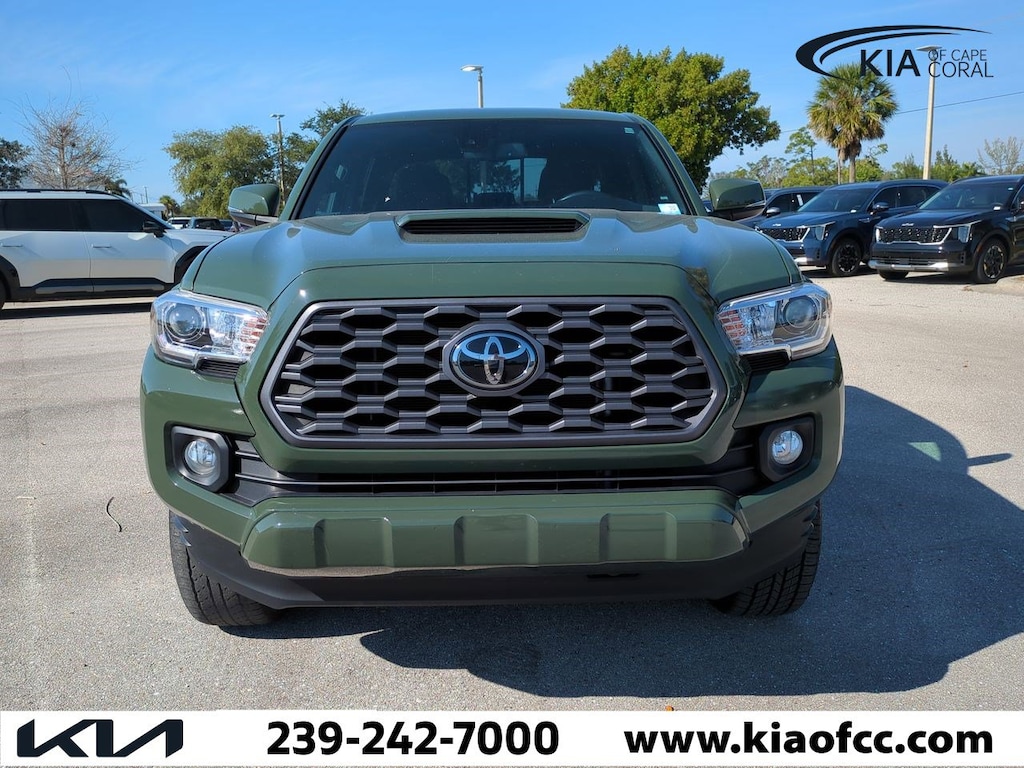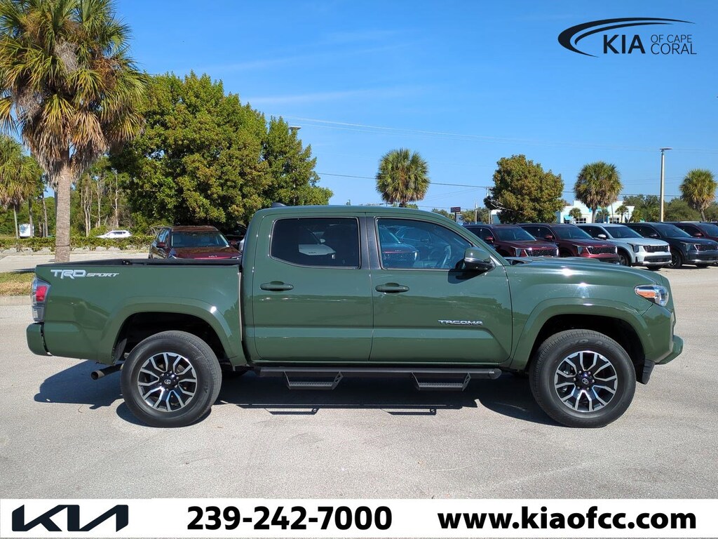 Tacoma TRD Sport V6, 4D Double Cab, 3.5L V6 PDI DOHC 24V LEV3-ULEV70 278hp, 6-Speed Automatic, RWD, Army Green, Cement Cloth, 120V/400W Deck Mounted AC Power, 6 Speakers, ABS brakes, Air Conditioning, Alloy wheels, AM/FM radio: SiriusXM, Anti-whiplash front head restraints, Apple CarPlay/Android Auto, Auto High-beam Headlights, Auto-dimming Rear-View mirror, Automatic temperature control, Axle Ratio: 3.91, Brake assist, Bumpers: body-color, Color-Keyed Rear Bumper, Driver door bin, Dual front impact airbags, Dual front side impact airbags, Electronic Stability Control, Emergency communication system: Safety Connect with 1-year trial, Engine Immobilizer, Exterior Parking Camera Rear, Fabric Seat Trim (FD), Front anti-roll bar, Front Bucket Seats, Front Center Armrest, Front dual zone A/C, Front fog lights, Front reading lights, Front Seats, Front wheel independent suspension, Heated door mirrors, Illuminated entry, Knee airbag, Leather Shift Knob, LED Daytime Running Lights & Fog Lights, Low tire pressure warning, Occupant sensing airbag, Outside temperature display, Overhead airbag, Overhead console, Panic alarm, Passenger door bin, Power Color Turn Mirror, Power door mirrors, Power driver seat, Power steering, Power windows, Radio: AM/FM Radio, Radio: Premium JBL AM/FM w/Nav & App Radio, Rear step bumper, Remote keyless entry, Security system, Smart Key w/Push Button Start, Speed control, Speed-sensing steering, Split folding rear seat, Steering wheel mounted audio controls, Tachometer, Telescoping steering wheel, Tilt steering wheel, Traction control, TRD Sport Package, Trip computer, Turn signal indicator mirrors, Variably intermittent wipers, Wheels: 17" x 7.5J Machined Alloy, Tacoma TRD Sport V6, 4D Double Cab, 3.5L V6 PDI DOHC 24V LEV3-ULEV70 278hp, 6-Speed Automatic, RWD, Army Green, Cement Cloth.